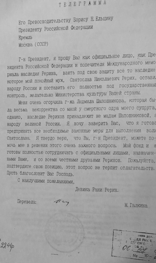 Телеграмма от 25.06.1993 от Девики Рани Рерих президенту РФ Б.Н.Ельцину